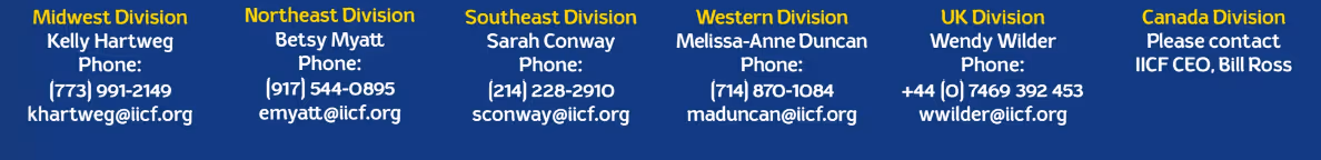 Please contact Bill Ross, IICF CEO, at bross@iicf.org to learn more about becoming an IICF Key Partner Company or contact the Executive Director in your region: